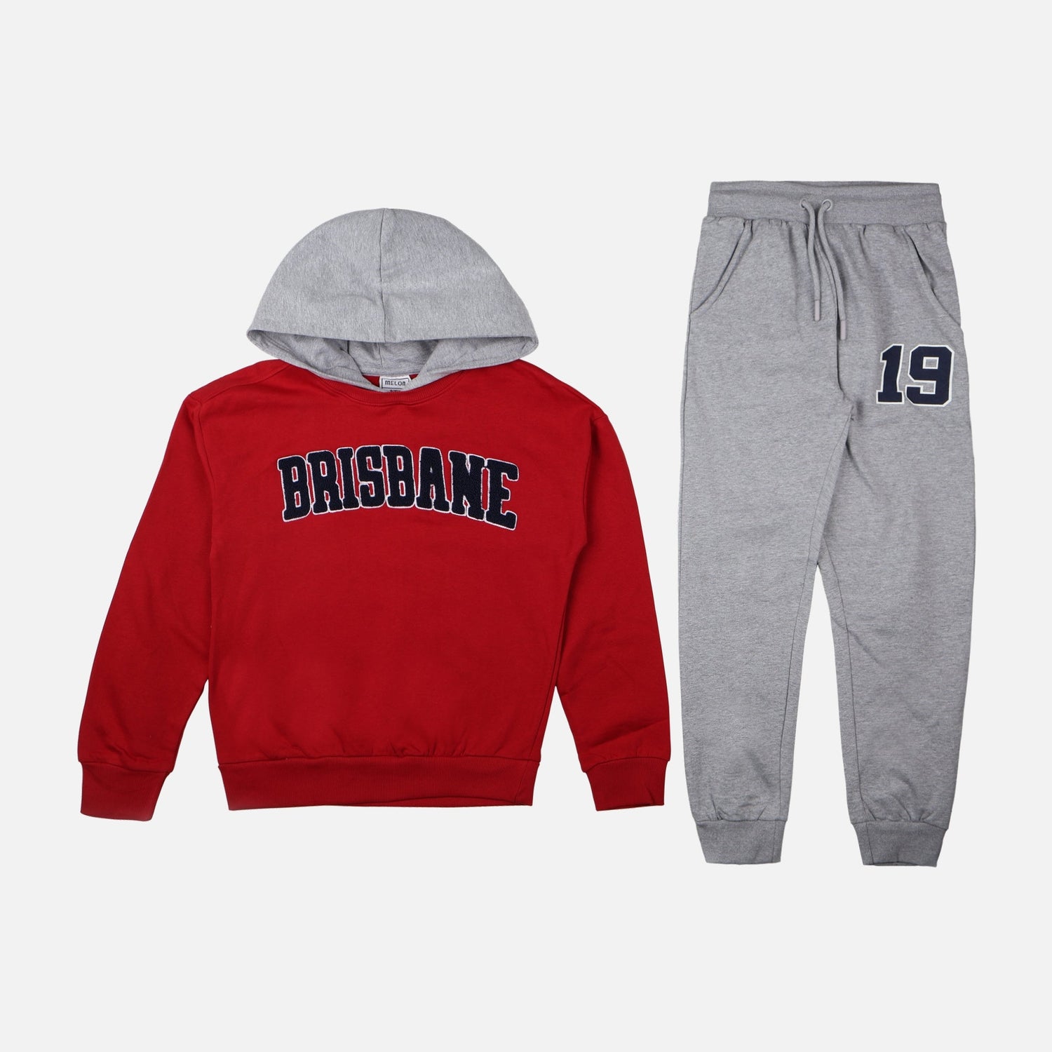 - هودي أحمر ملفت مع شعار BRISBANE ورقعة رقم 19 على البنطال يضيفان لمسة رياضية.