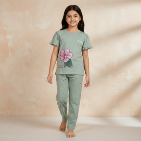 طقم بجامة بناتي يجمع بين الراحة والأنوثة في تصميم واحد: تيشيرت بلون أخضر ساج مع طبعة زهريّة وردية كبيرة ينسجم مع بنطال بنقاط داكنة، ليمنح الفتيات مظهرًا لطيفًا ومريحًا للنوم والأنشطة المنزلية خلال فصول الربيع والصيف. مناسب للاستخدام كبيجاما منزلية يومية، يتيح حركة سهلة وتهوية جيدة ليلاً.
