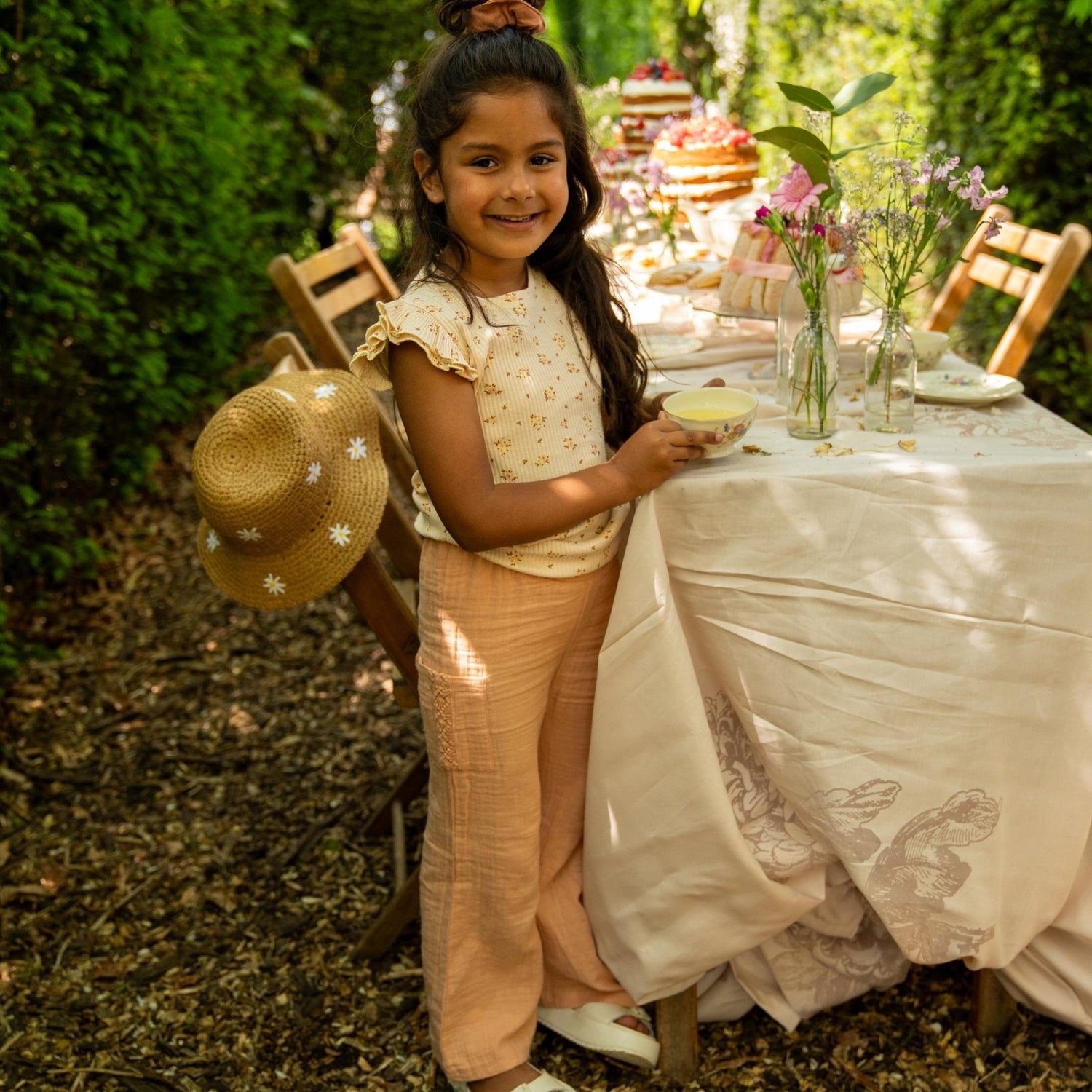 كل يوم سيكون احتفالًا مع أزياء كوكو نوكو الصيفية الملونة! هذا البنطال الواسع مصنوع من قماش الموسلين الناعم والمنعش، بلونه الوردي الخوخي وتصميمه العملي مع جيوب جانبية مزينة بالكروشيه. نسقيه مع تيشيرت من كوكو نوكو لإطلالة صيفية مرحة وأنيقة.