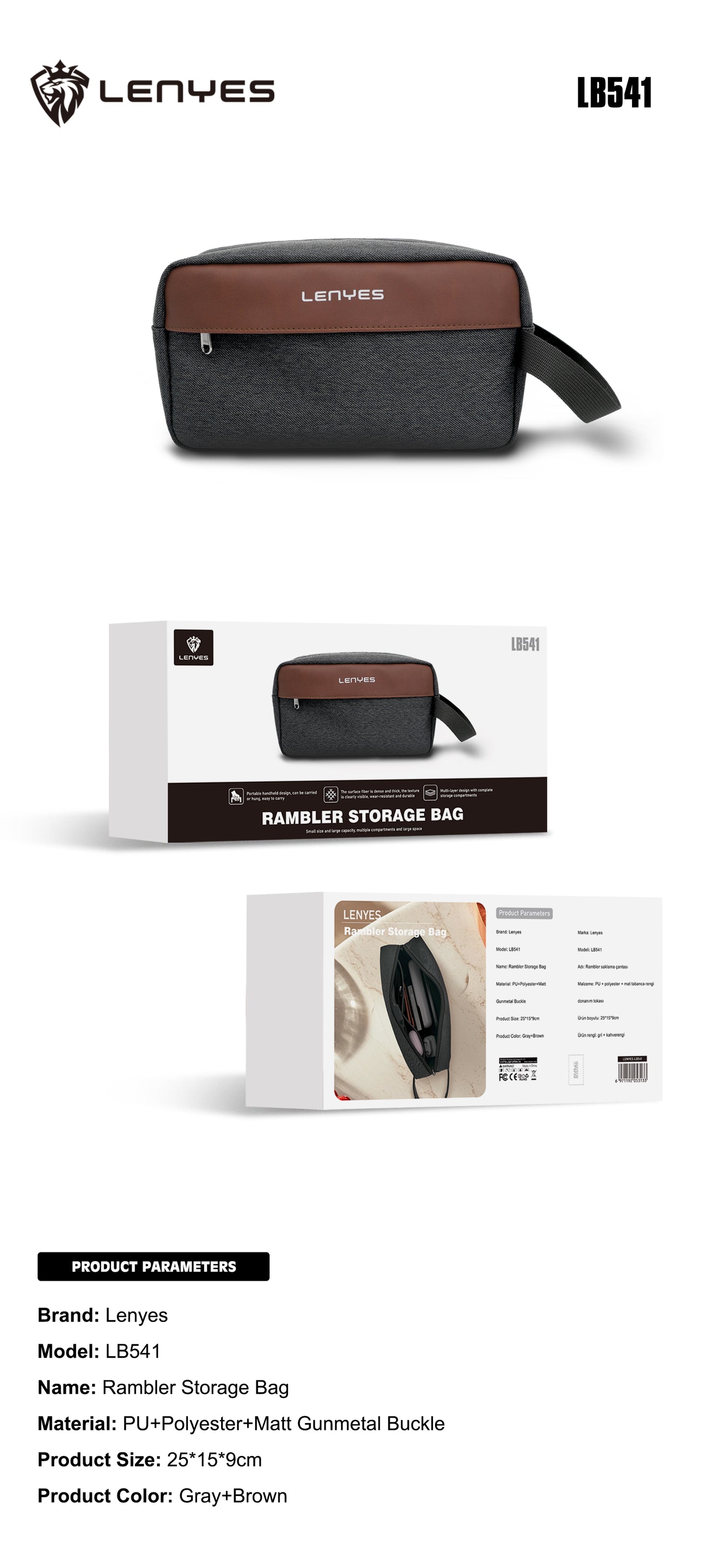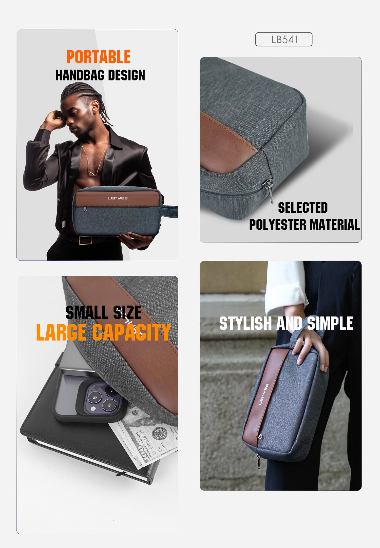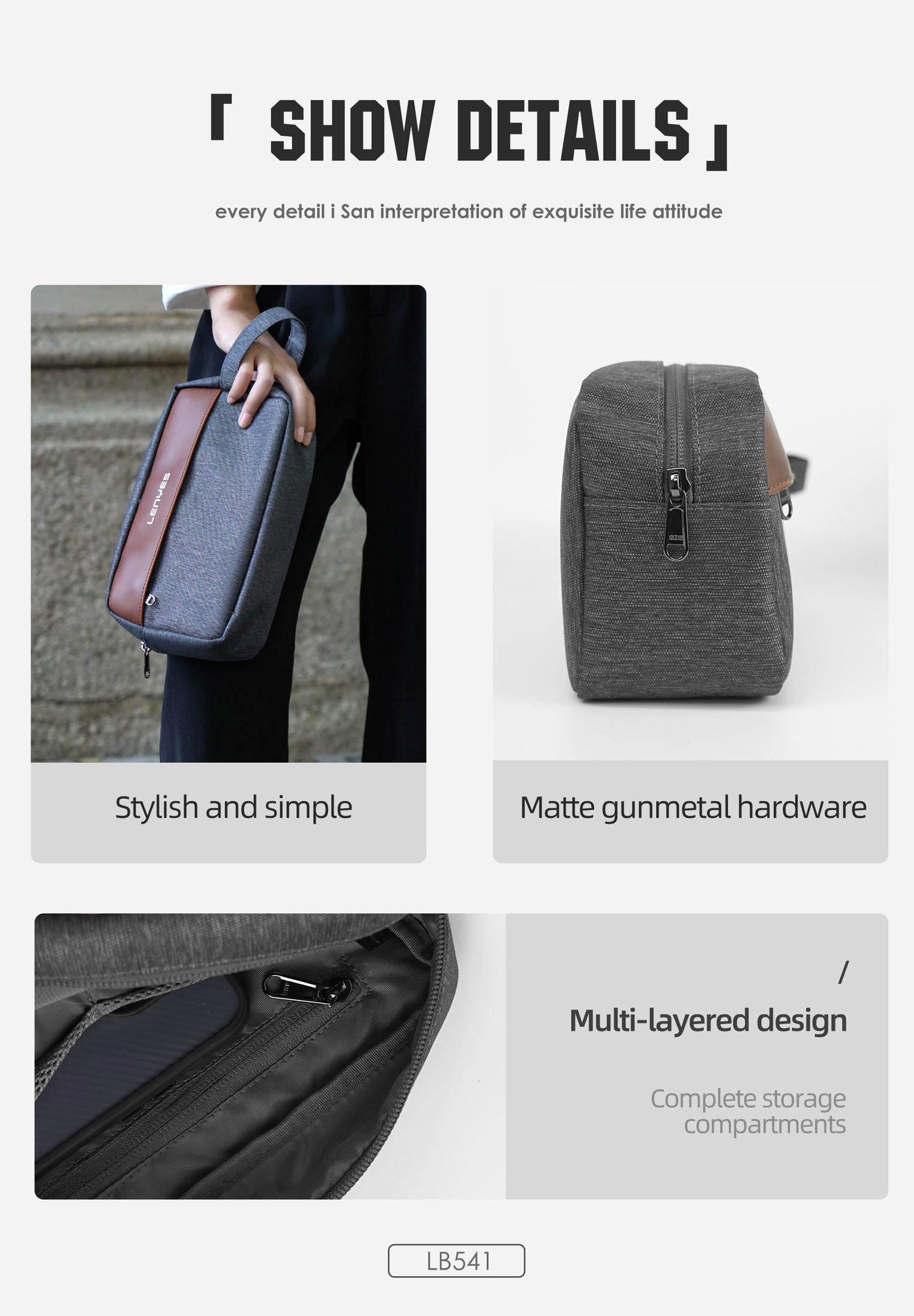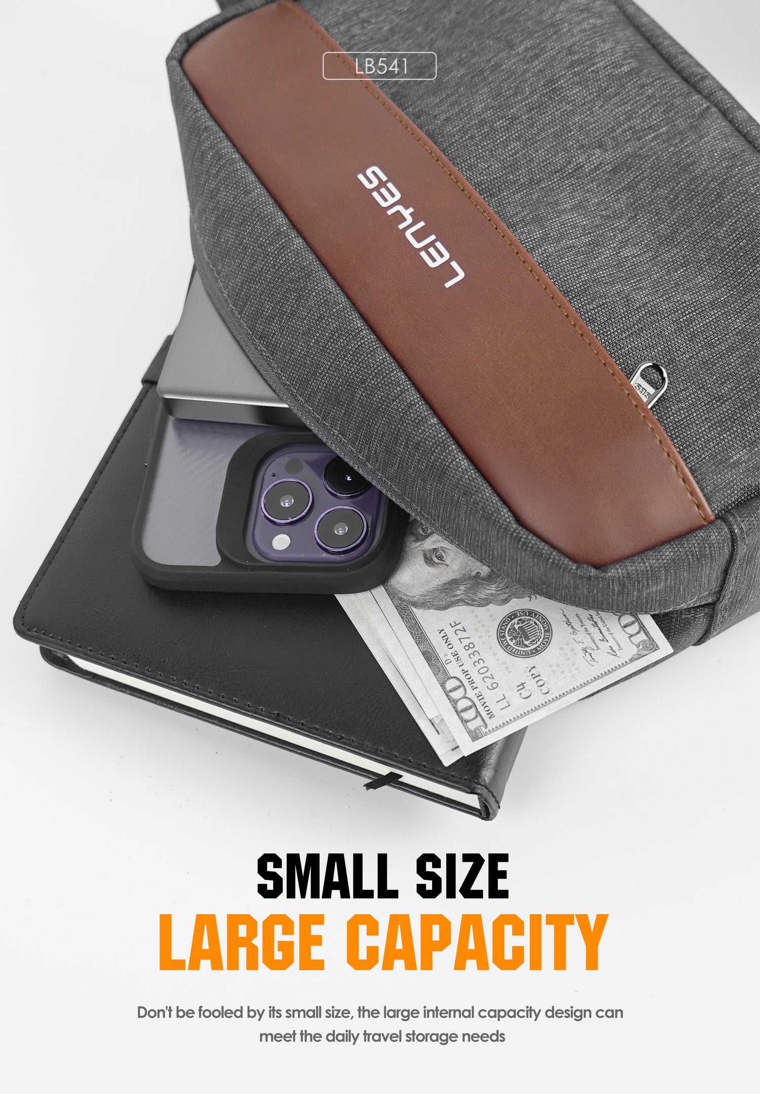 - مظهر متين وأنيق: تباين الرمادي مع لمسة بنية وتفاصيل معدنية دقيقة يحققان مظهرًا راقيًا يناسب العمل والسفر القصير.