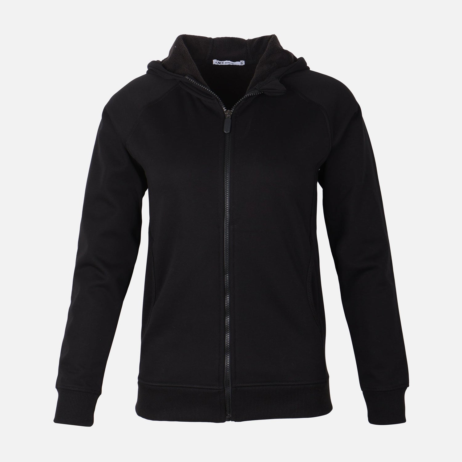المواصفات والتصميم: هودي أسود بسحّاب كامل مع غطاء رأس مبطّن بالفليس، جيوب جانبية مخفية، أساور وحافة مضلعة وسحّاب أمامي ناعم — مصمم للاستخدام اليومي بلمسة نقية وبسيطة.