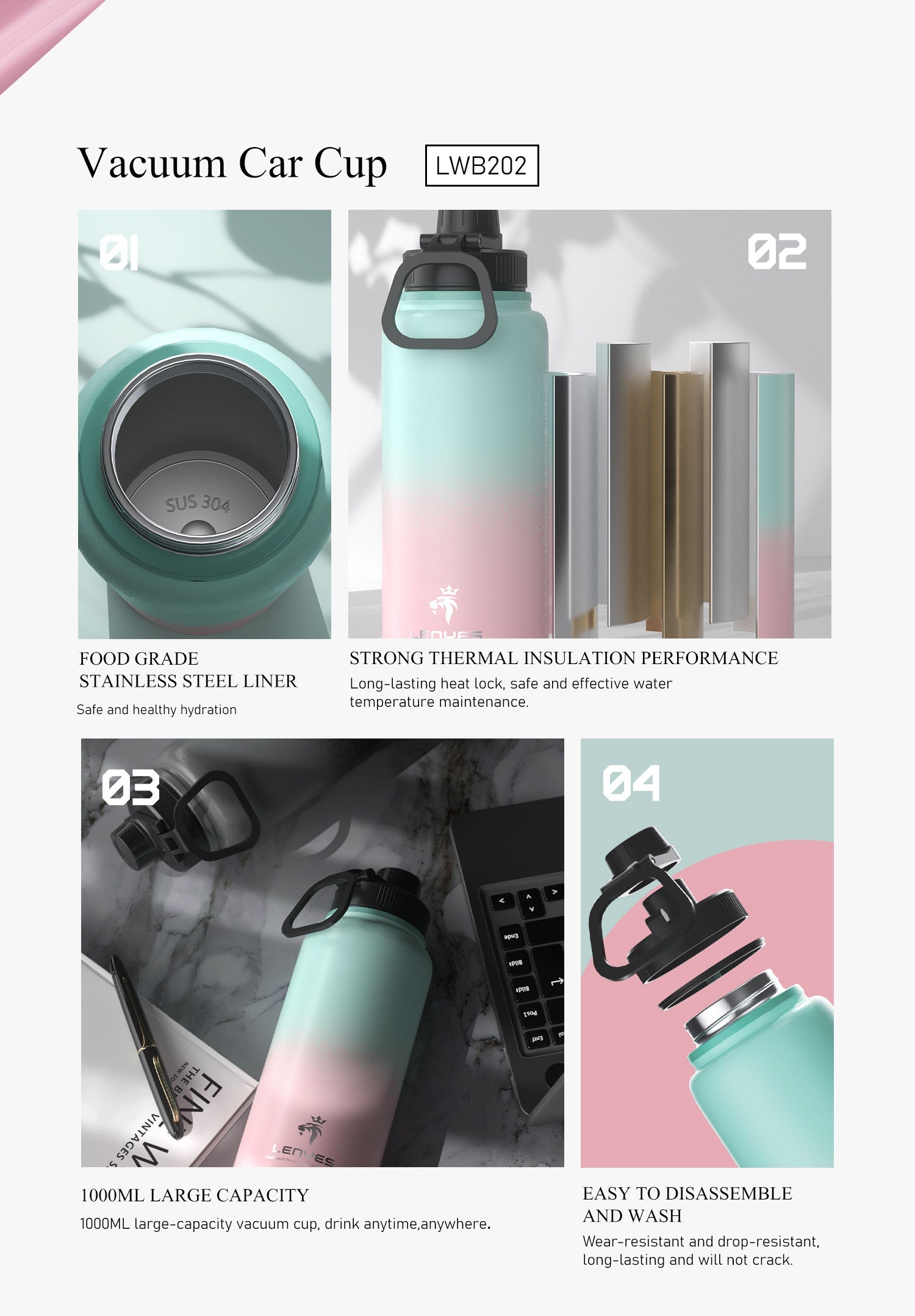 Meet the LENYES CUP LWB202, a 1000 ml hydration companion engineered for the everyday and the adventurous. Its two-layer stainless steel build combines durability with a sleek, modern aesthetic, making it a reliable partner from early commutes to weekend getaways. The bottle’s gradient finish adds a subtle, contemporary flair without sacrificing practicality or comfort in hand.