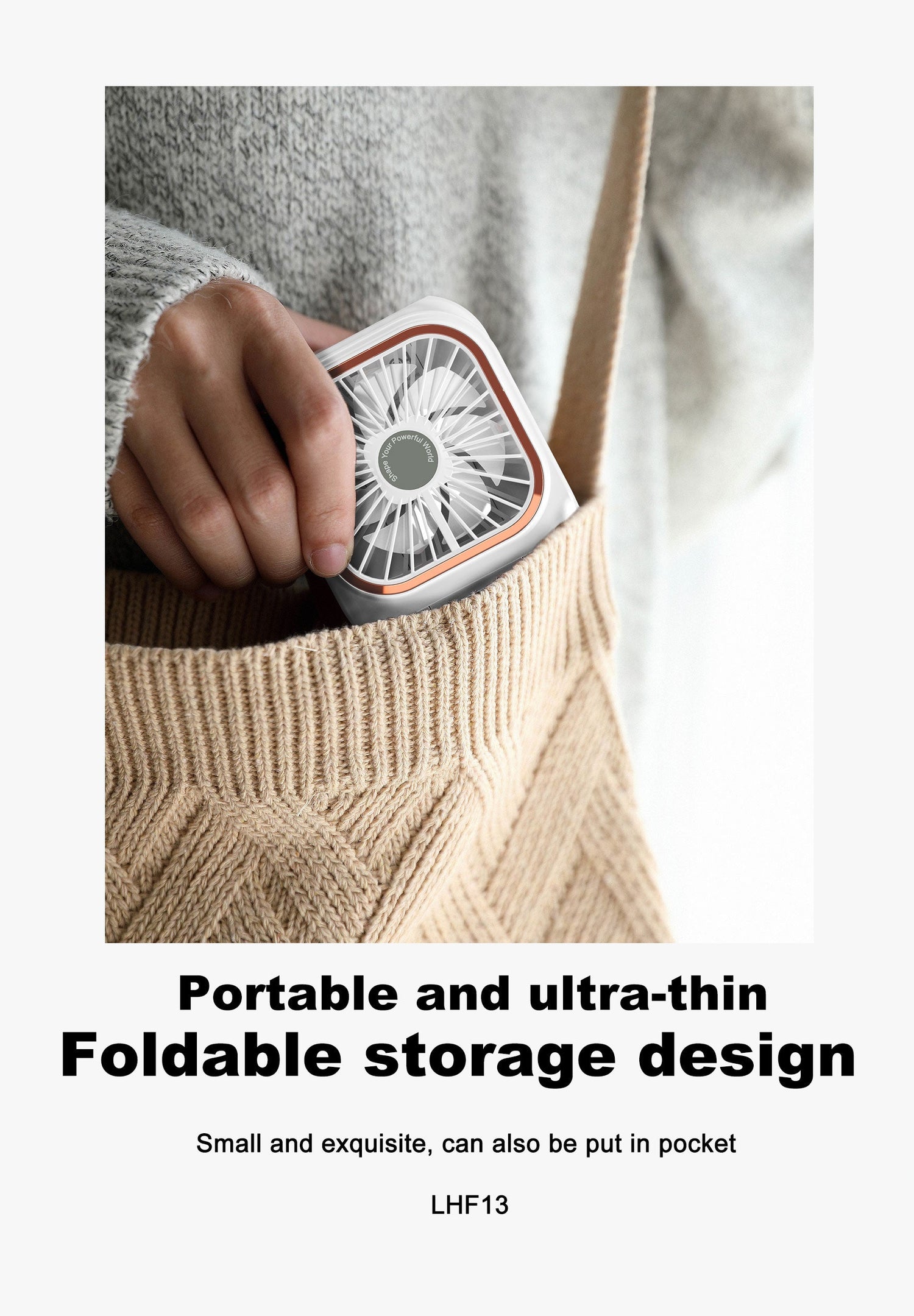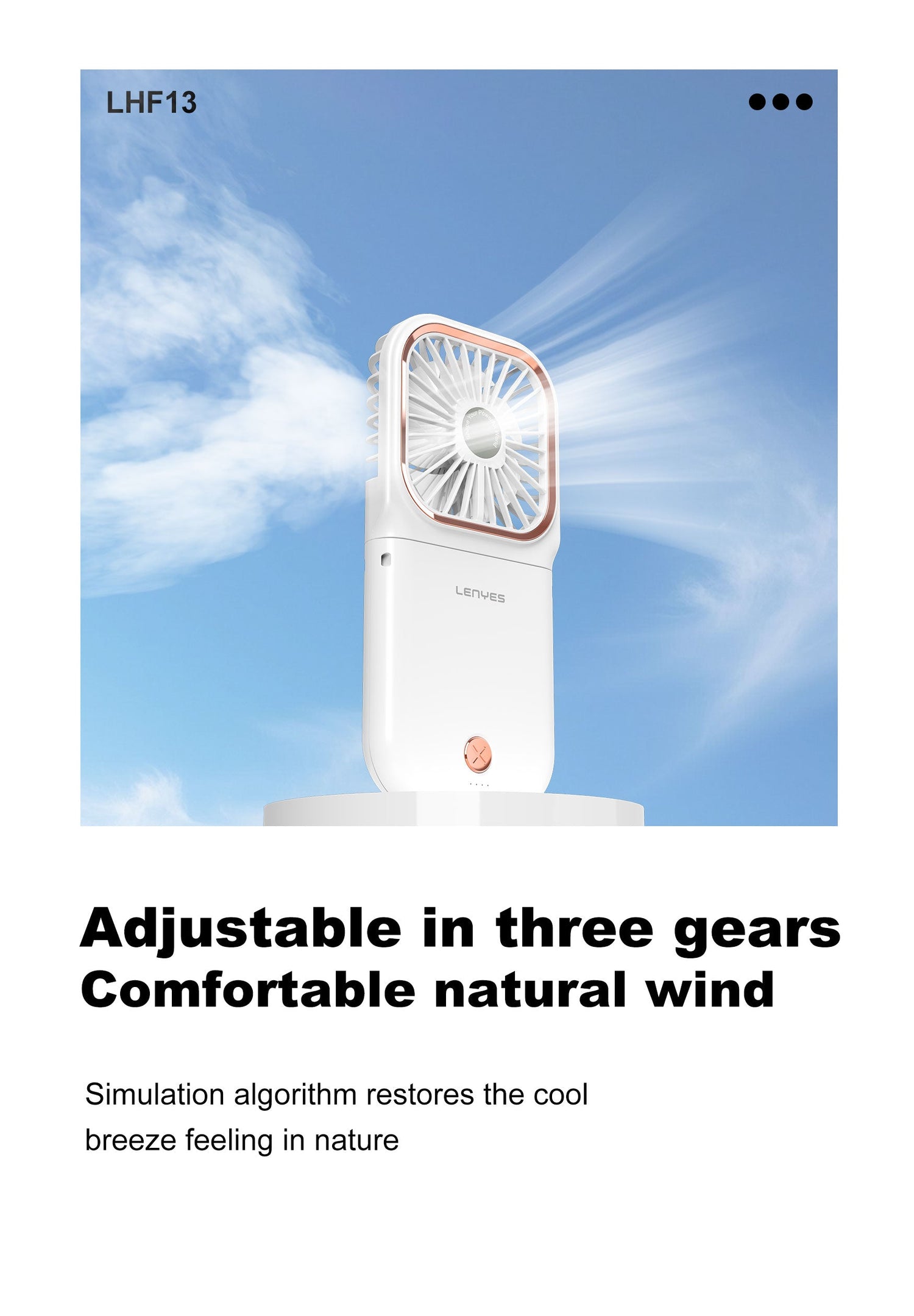 - Three adjustable speeds for personalized comfort: Choose from first, second, or third gear to tailor the airflow to your activity. The fan operates at up to 5W, with a simple, responsive control surface featuring premium electroplated buttons and borders for a refined feel.