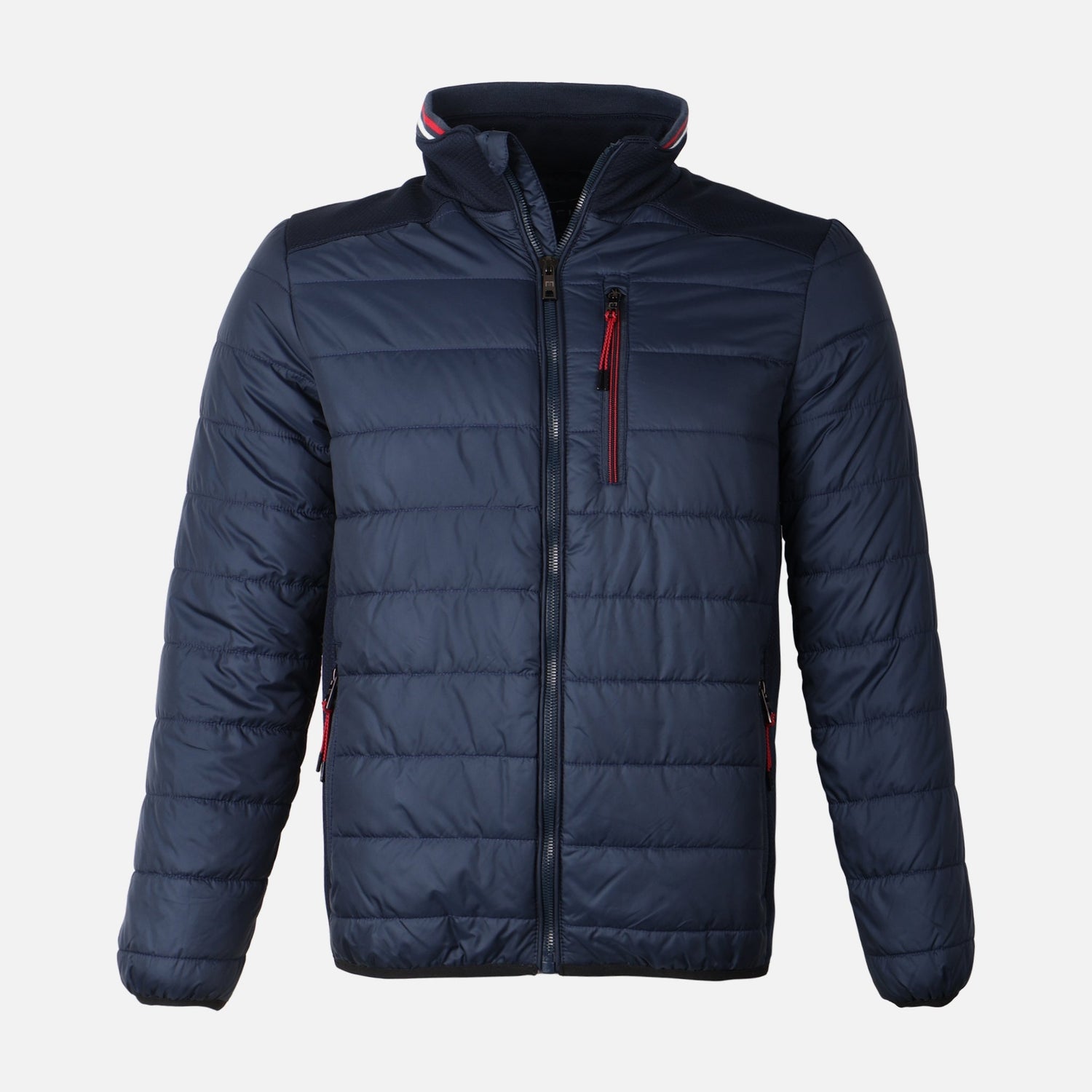 Key Features & Design: This jacket features horizontal quilted channels for uniform insulation, a high stand collar with soft lining, and practical zip pockets accented by red pulls for easy access. The smooth polyester shell has a subtle sheen and the elasticated cuffs and hem offer a neat finish that keeps the silhouette tidy.
