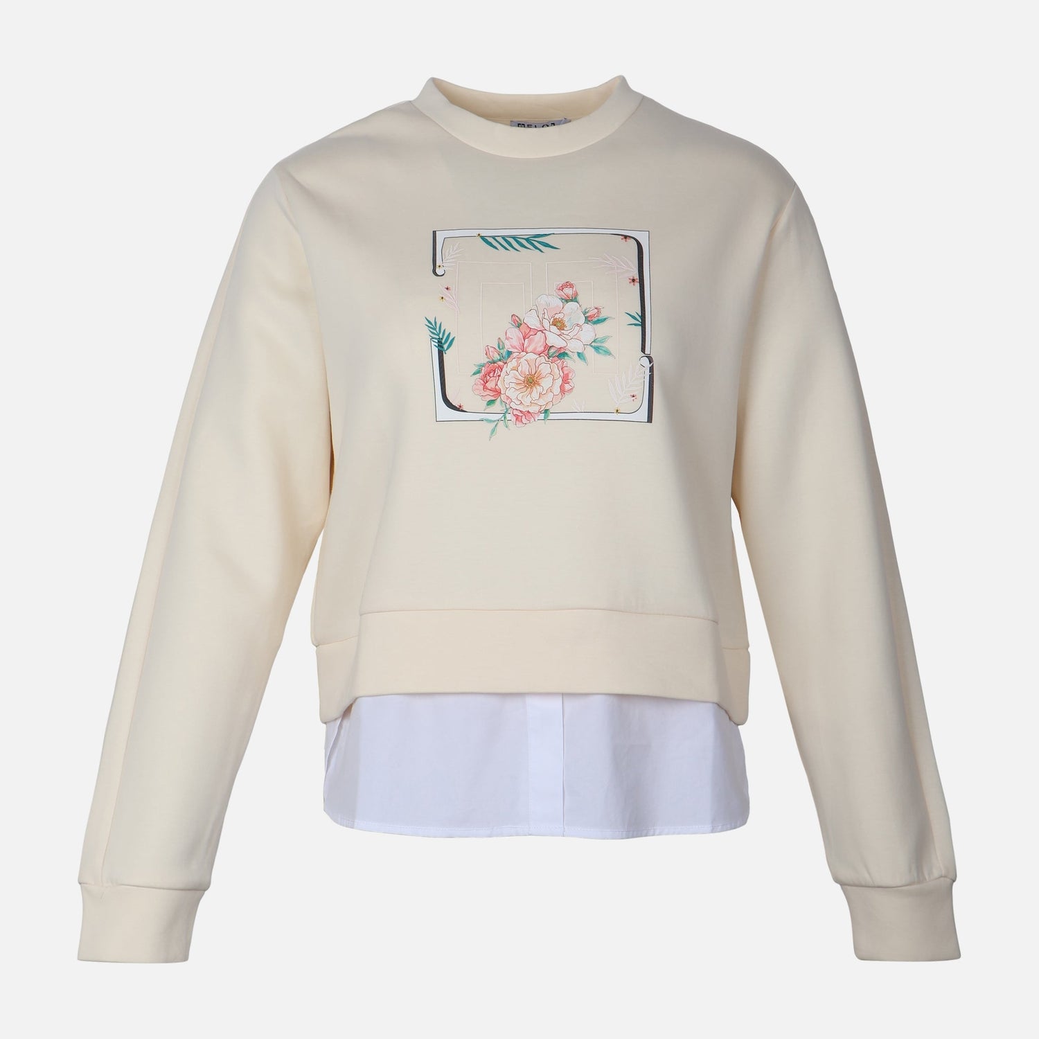 Key Features & Design: This sweatshirt pairs a minimalist silhouette with a decorative floral panel and an integrated white shirt hem for a polished casual aesthetic. The ribbed neckline and cuffs maintain a neat finish while the soft, slightly stretchy fabric keeps the fit comfortable throughout the day.