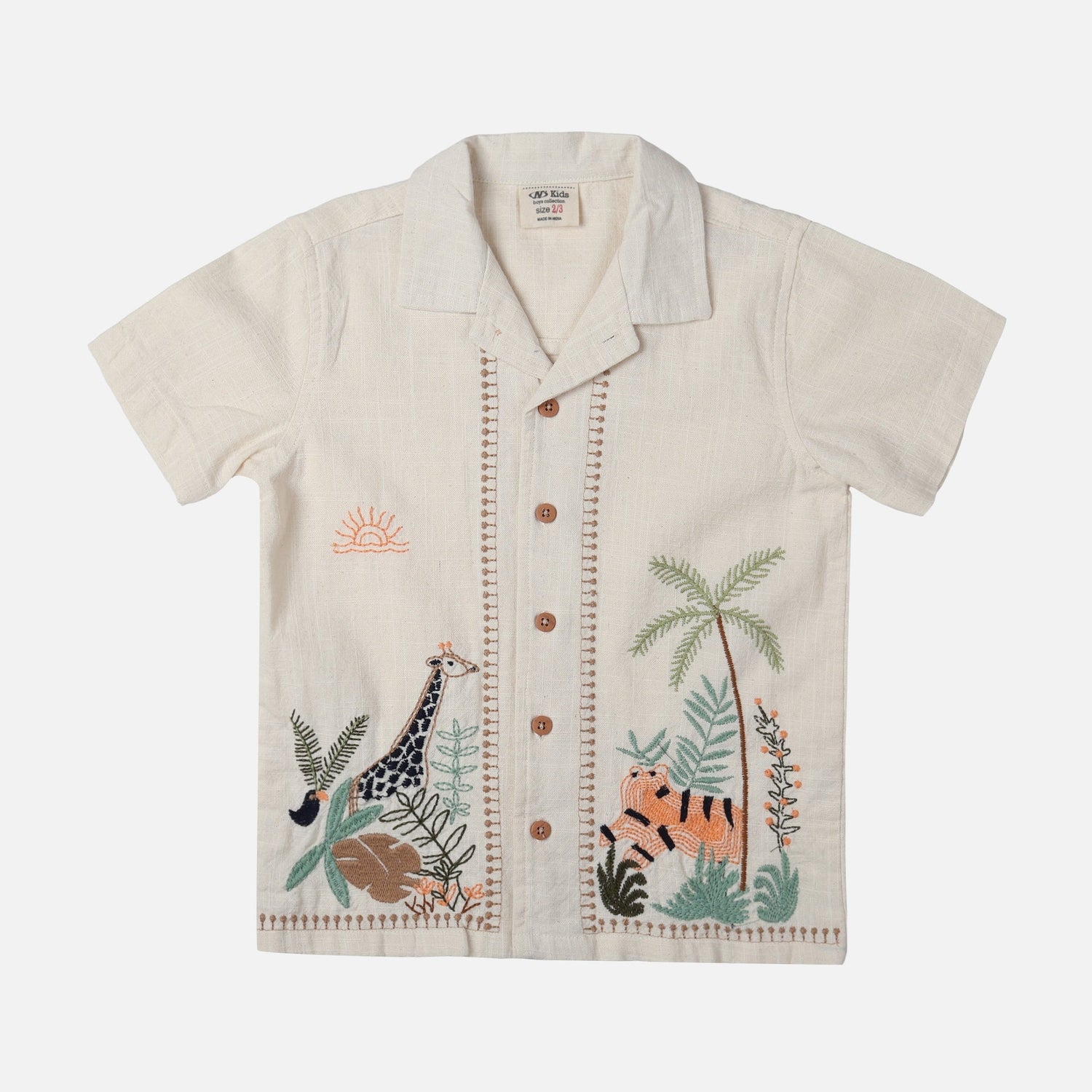 This boys short-sleeve shirt from the Eid Collection blends playful jungle embroidery with lightweight fabric, delivering a festive, comfortable option for spring and summer celebrations.