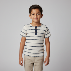 Discover the Boys T‑Shirt from the Jaqard Eid Collection—a breathable knit tee designed for active kids, perfect for Spring and Summer wear with navy stripe detail.