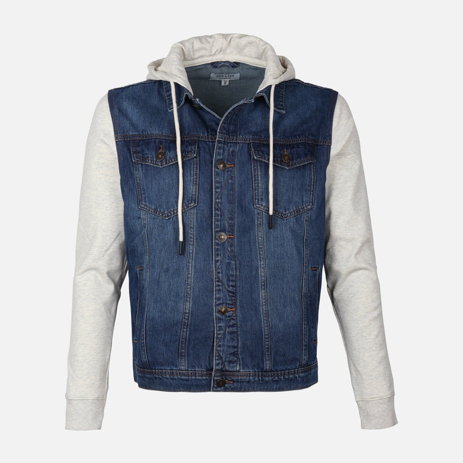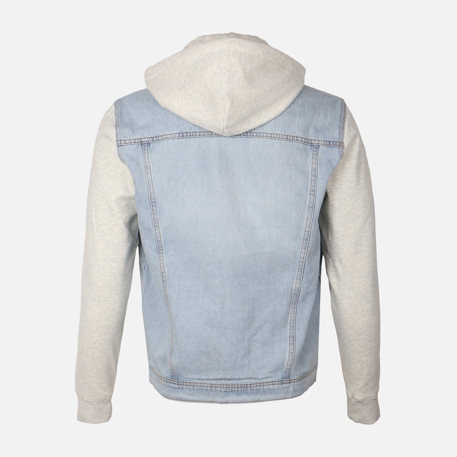 - Hooded denim jacket silhouette with a cozy knit hood and drawcords.