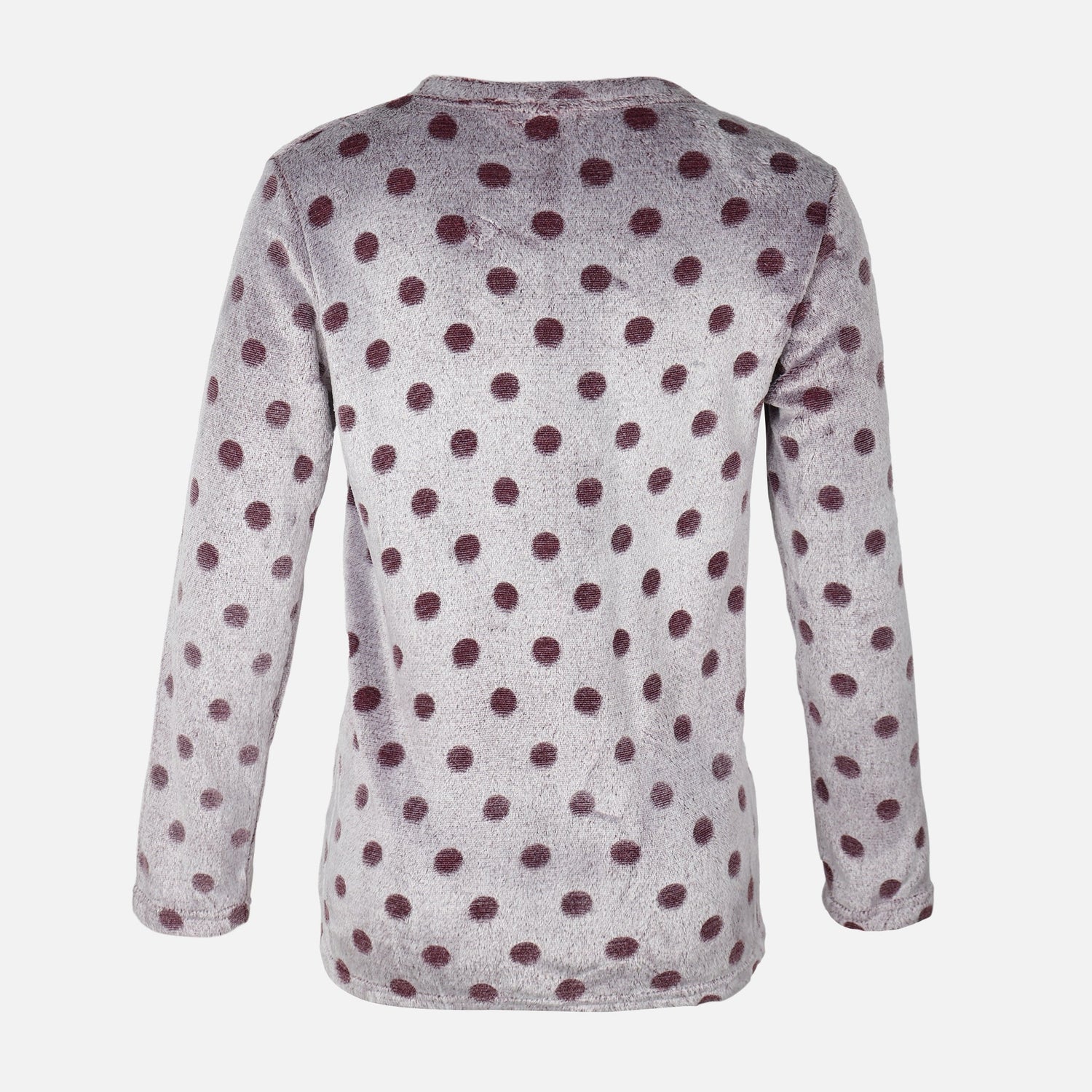 Color: Grey heather base with deep burgundy polka dots.