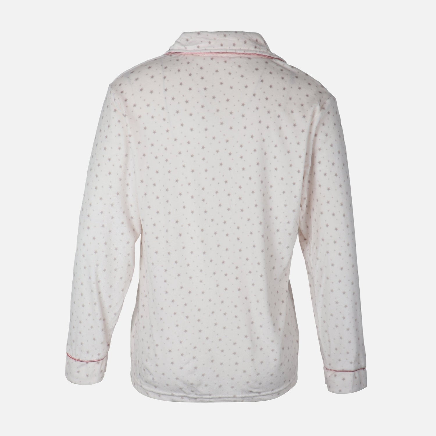 Color: Cream/ivory base with a delicate grey star print and pink piping along the collar and cuffs for a gentle, feminine accent.