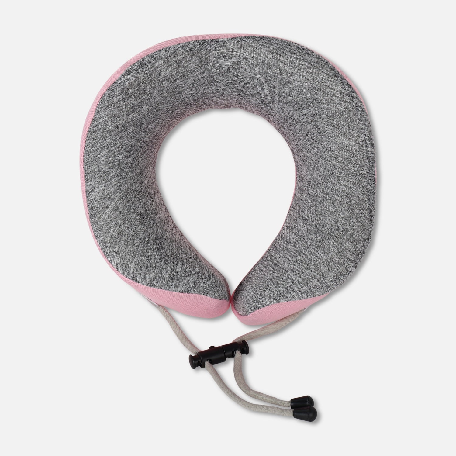 A memory foam neck pillow designed for travelers seeking dependable neck support on flights, trains, and road trips, pairing a soft pink exterior with a grey contoured top for ergonomic, all-day comfort.