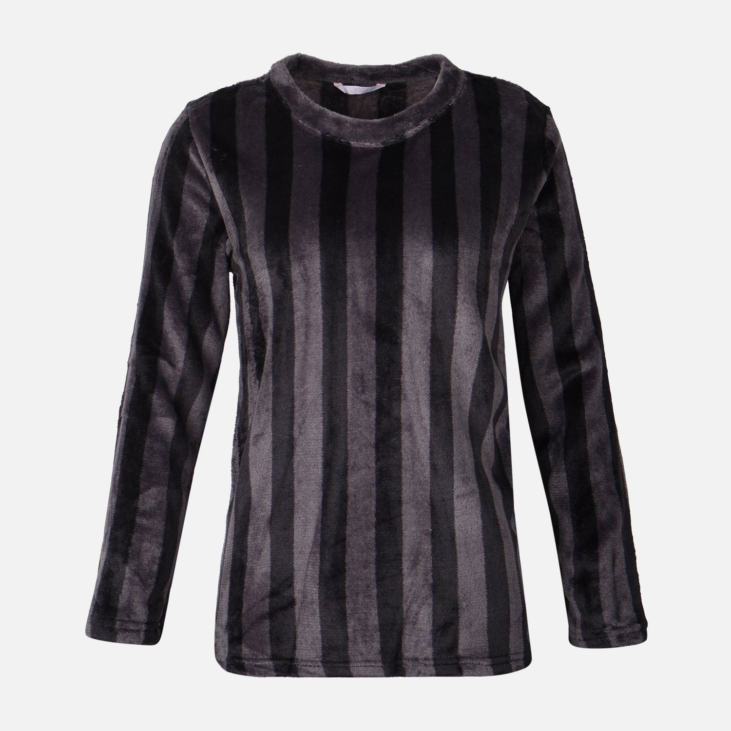 Color Charcoal-black striped top with solid charcoal-gray pants for a coordinated, modern look.
