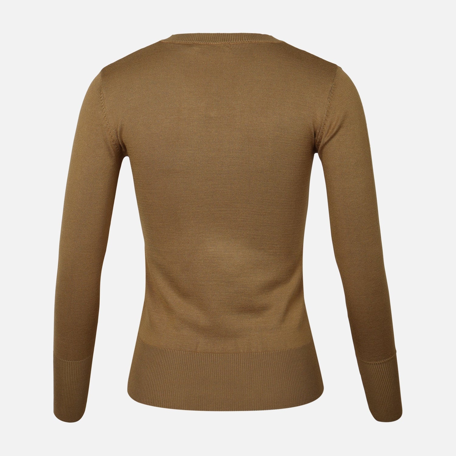 Key Features & Design: This sweater features a refined V‑neck, long sleeves, and ribbed trims at the hem and cuffs. The fine, even knit delivers a smooth surface and subtle drape, making it an ideal base layer or standalone piece. The neutral camel tone provides easy coordination with seasonal wardrobes.