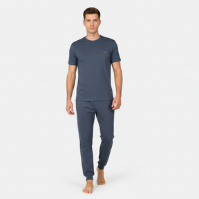This men's 2-piece set pairs a comfortable cotton crew-neck T-shirt with matching drawstring pants for casual, spring–summer wear, offering a regular-fit look that’s easy to mix and match.