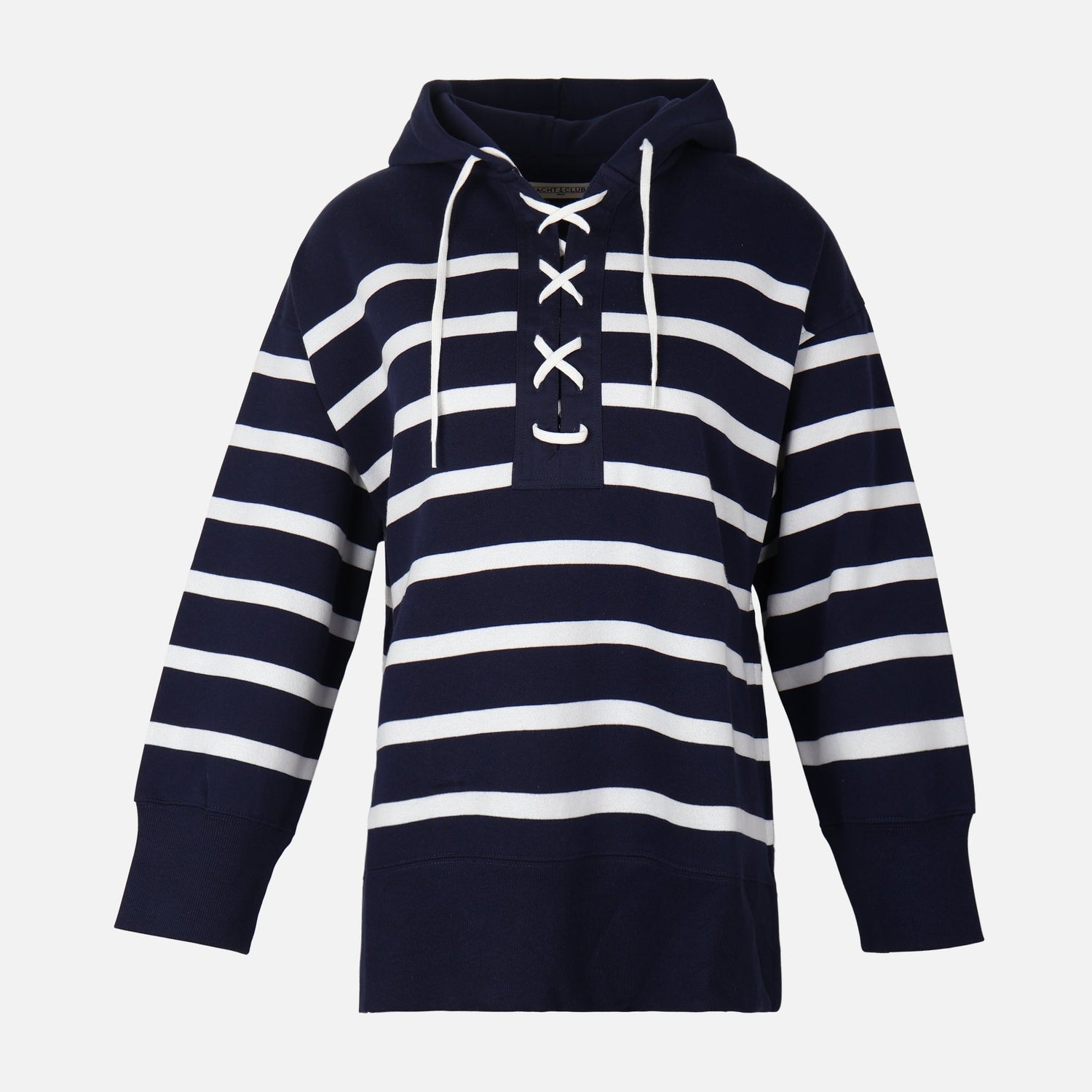 Introduction – A relaxed pullover hoodie designed for everyday coastal-inspired style, this women's fashion hoodie combines soft cotton-blend comfort with a distinctive lace-up neckline and bold horizontal stripes for casual, modern appeal.